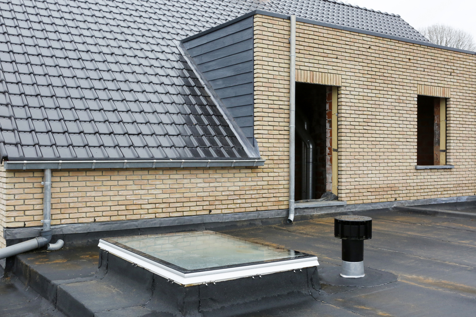Bij dit bijgebouw vertoonde het platte dak lekkages door slijtage van de dakbedekking.